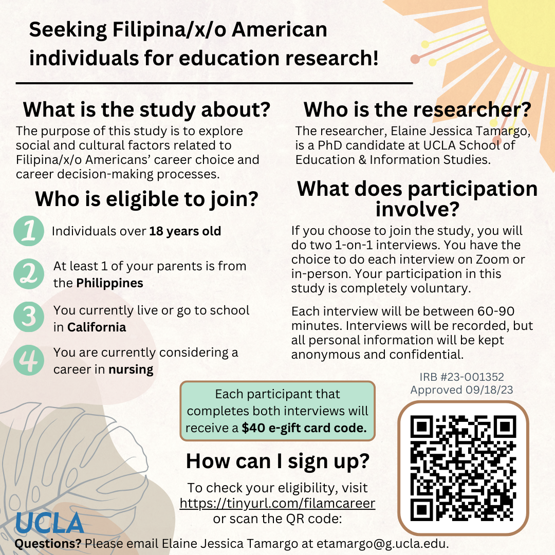 If you are interested in participating, please review the attached recruitment flyer with more information and fill out the intake questionnaire at tinyurl.com/filamcareer. If you would like more information, or have questions, please Elaine at etamargo@g.ucla.edu.